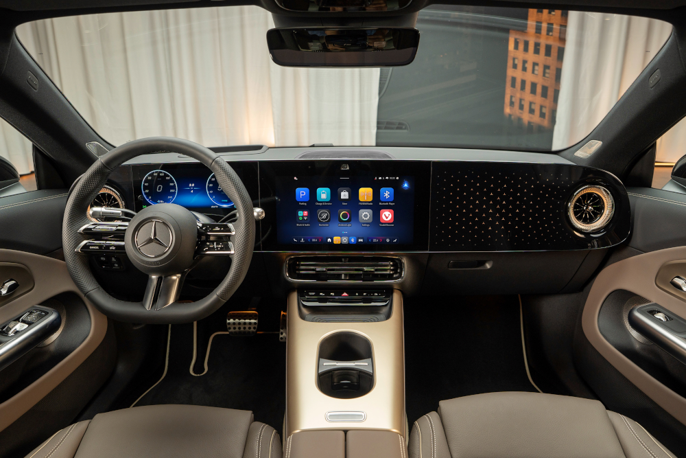 新型CLAのインテリアは、運転席には10.25インチ、中央に14インチのディスプレイを配置。さらにオプションで助手席にも14インチのディスプレイを設定できるMBUXスーパースクリーンを採用しています。くわえて、センターコンソールは宙に浮いているかのように高くレイアウトされ、スポーティな雰囲気を高めています。また上下2段の構造となっており、ダブルカップホルダーとスマートフォン用のワイヤレスチャージングパッドも備えています。