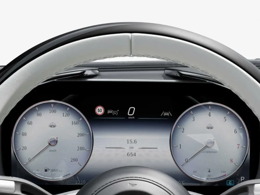 もうひとつ目を引くのがステアリング奥に配置されるデジタルコックピットディスプレイ。スポーティさを強調したメルセデスAMG SLとは異なり、ローズゴールドを基調としたスタイルで、メーター部分にはリングのモチーフが施された、クラシカルなイメージの気品を感じさせるデザインになっています。インテリアデザインも相まって華やかな気分で運転ができそうです。
