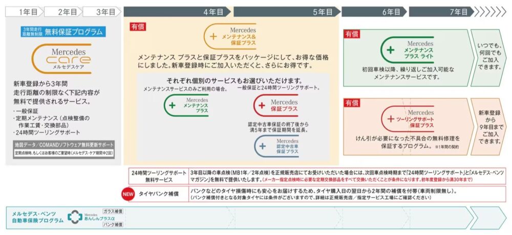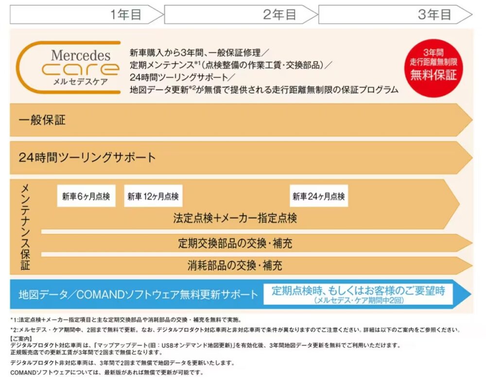 ▲「メルセデス・ケア」の内容。これらがすべて無料でついている(メルセデス・ベンツ日本HPより)