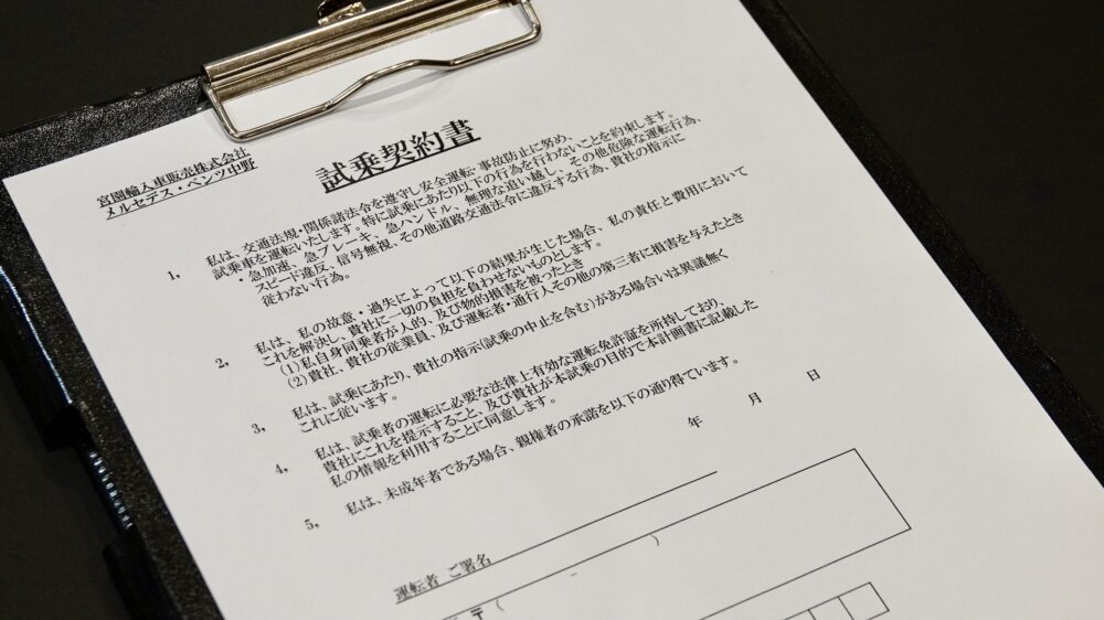 ▲試乗前には「試乗契約書」に必要事項を記入する