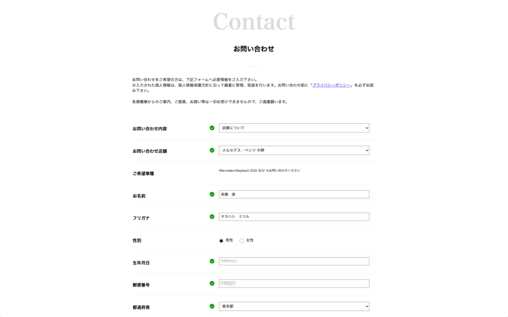 ▲氏名、生年月日、住所、電話番号、メールアドレスなど、試乗申込みに必要な事項を入力します。