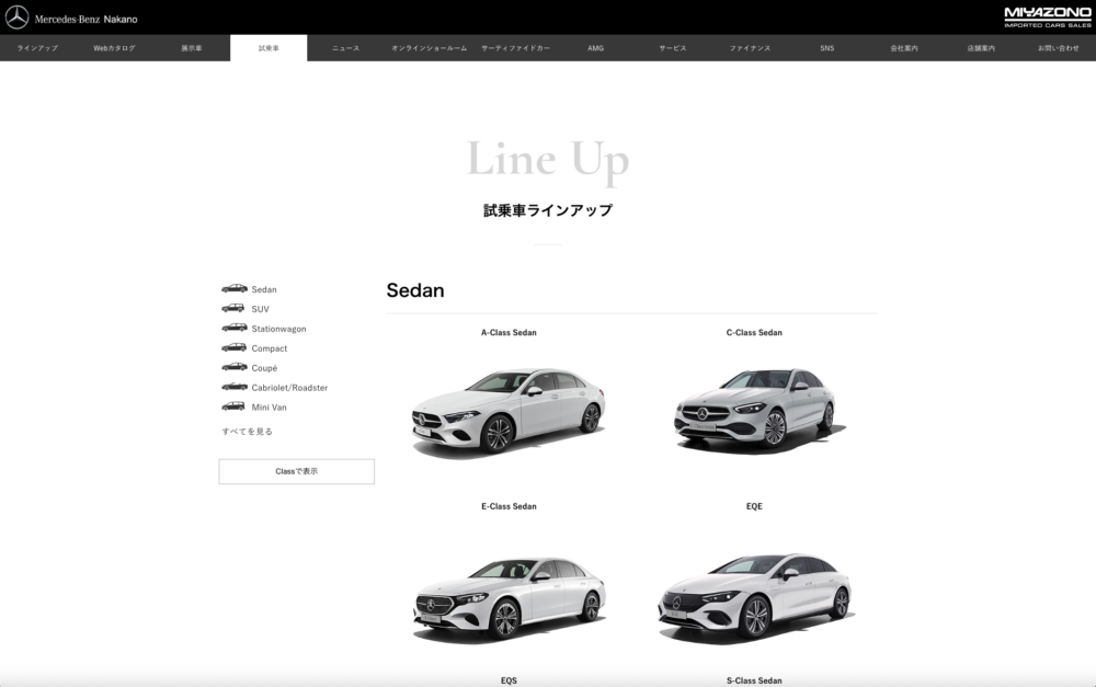 ▲まずは試乗を希望するディーラーのウェブサイトにアクセスします。私は自宅から近いメルセデス・ベンツ中野を選びました。ページのトップ(グローバルナビゲーション)にある「試乗車」をクリックします。