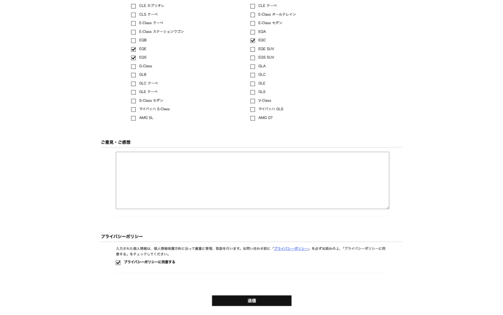 ▲試乗希望日時は「ご意見・ご感想」欄に記入。その他必須事項を入力したら、ディーラーのプライバシーポリシーに目を通したうえで、「プライバシーポリシーに同意する」にチェックを入れて送信ボタンをクリック。