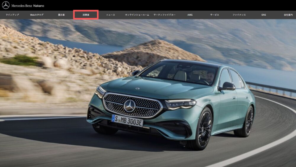 ▲まずは試乗を希望するディーラーのウェブサイトにアクセスします。私は自宅から近いメルセデス・ベンツ中野を選びました。ページのトップ(グローバルナビゲーション)にある「試乗車」をクリックします。